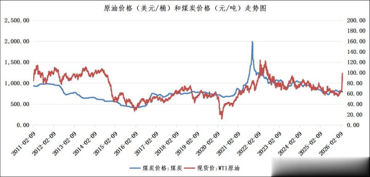 从2011—2026年走势看,两者呈现强趋势联动+阶段性背离的特征。2011—2016年,原油价钱从100好意思元/桶上方回落至30好意思元隔壁,煤炭价钱同步从约1000元/吨跌至500元/吨以下,考证了恒久同向性;2020年疫情冲击下,两者同步暴跌,随后在群众宽松与需求复苏下共振反弹。而2022年的显赫背离则源于俄乌冲突:欧洲动力危境推升煤炭价钱至2000元/吨以上,原油虽同步冲高但幅度有限,此时地缘冲突主导了价钱波动,短期冲破了老例联动规章。