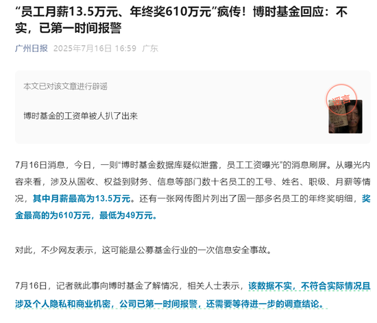 这并非博时基金近期初度堕入公论旋涡。王德英的卸任公告,令东说念主不禁回念念起2025年7月那场沸沸扬扬的“年终奖泄密事件”。据广州日报音问,2025年7月16日,一则“博时基金数据库疑似露出,职工工资曝光”的音问刷屏。从曝光内容来看,波及从固收、权力到财务、信息等部门数十名职工的工号、姓名、职级、月薪等情况,其中月薪最高为13.5万元。还有一张网传图片列出了固一部多名职工的年终奖明细,奖金最高的为610万元,最低为49万元。
