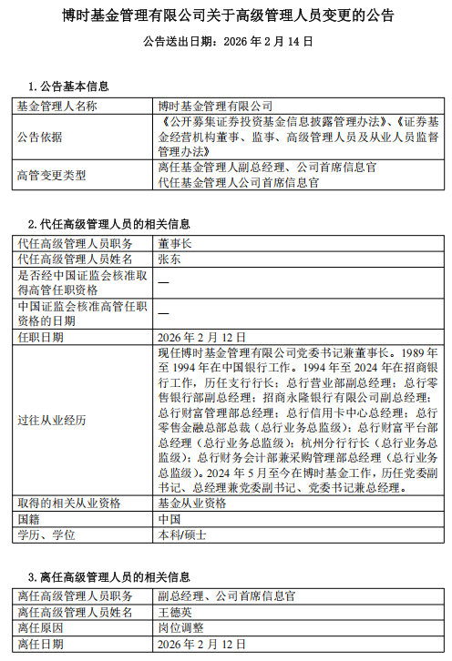 2月14日,情东说念主节,三街六巷最先豪阔起玫瑰与巧克力的甜腻气味,基金圈亦迎来一则东说念主事变动的音问。零点时期,博时基金发布高档解决东说念主员变更公告,公司副总司理、首席信息官王德英因“岗亭调遣”离任,转任公司首席技艺行家,董事长张东将代任首席信息官一职。